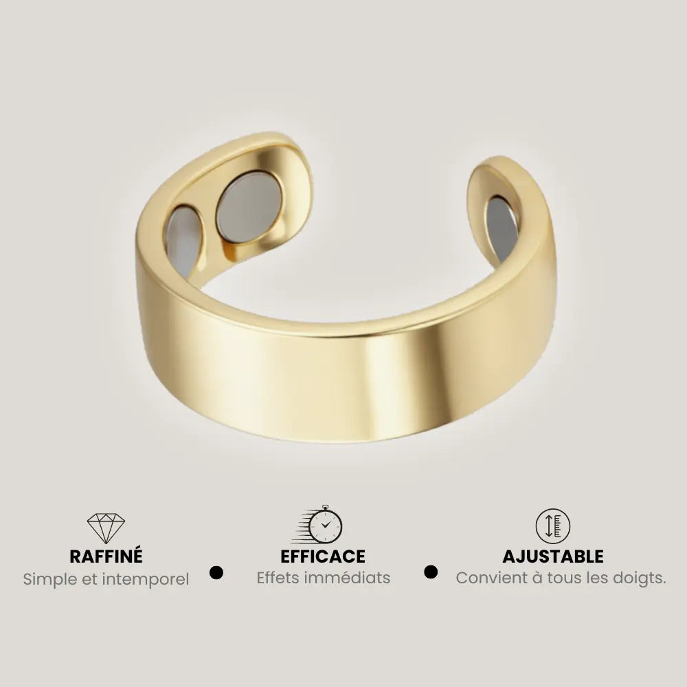 La bague est ajustable. Positionnez-la de sorte que les points magnétiques soient en contact avec la peau.